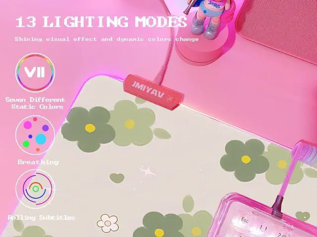 13 Lighting Modes Gaming Mouse Pad Super Glow Fiber provides a great RGB back lit effect. You can choose from 13 lighting modes: 9 static light modes and 4 dynamic mode. ^^ Large Size Gaming Mouse Pad at 31.5 x12 x 0.2 inch The gaming mouse pad will fit your mouse perfectly and provide enough mouse movement space, suitable for all types of mice. ^^ Easy to use, Plug & Play Gaming Mouse Pad This extended mouse pad is powered by USB, plug and play, no driver required. The control button of this mouse pad has been tested for 10 million times and is extremely durable. Just press it to choose the lighting mode you want. Press and hold about 3 seconds turn ON/OFF. And it has power off memory function remembers your last mode selection. ^^ Non-slip & Waterproof Gaming Mouse Pad The durable, non-slip rubber base is designed to eliminate unwanted movement and provide a solid platform for eSports gaming. Waterproof coating surface effectively prevent accidental damage from spilled liquid. ^^ ULTRA SOFT & SMOOTH SURFACEDesign with superfine fiber braided material, and allows more accurate mouse movement. Very comfortable when the wrist touches the surface, Best idea for game or work.