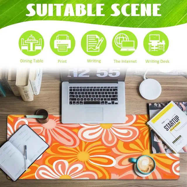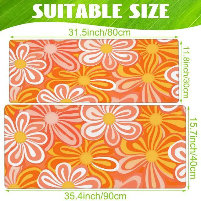 Eflxamz Desk Pad - Hippie Vintage Orange Flowers Desk Mat, Retro Floral Large Gaming Mouse Pad with Non-Slip Base and Stitched Edge, 31.5"x11.8"