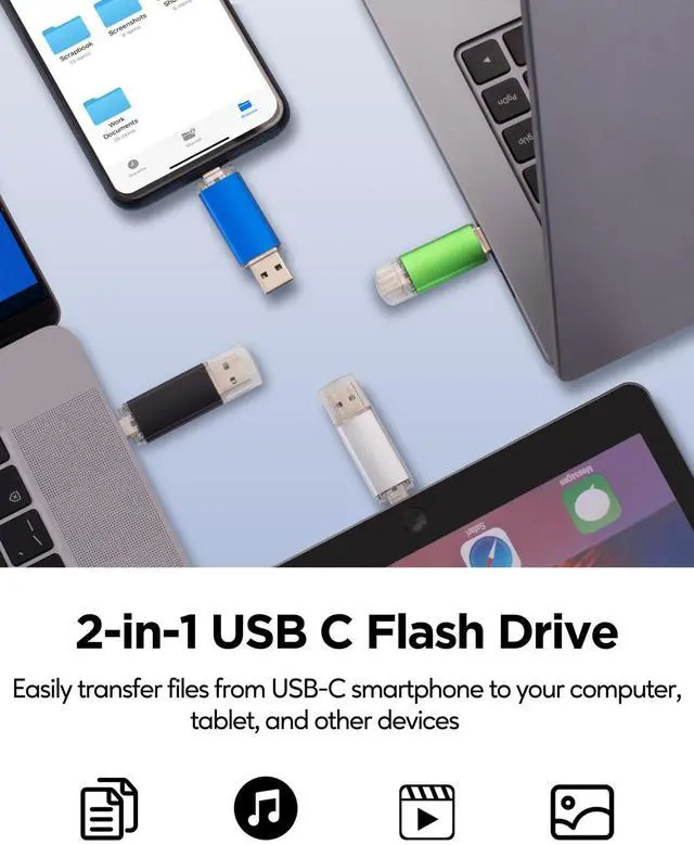 DUAL FLASH DRIVE - 2-in-1 USB flash drive is designed with a USB-C plug and a USB-A plug at each end, Dual USB flash drive allows you transfer data between smartphone/tablet and computer more conveniently ^^ PLUG AND PLAY - AreTop USB drive with USB A & Type C simply plug in thumb drive then start transferring and storing data between devices. There is no need to install any software, so you can easily transfer files, pictures, music and videos at high speed. If plug, it works. Easy and convenient! Free up space on your USB Type-C smartphone ^^ WIDE COMPATIBILITY - This 32GB usb stick can be used with laptops, computers, tablets, Android USB-C phones, iPhone15 Series, iPhone16 Series, car audio, printers, smart TVs, embroidery machines, Xbox, PS4.