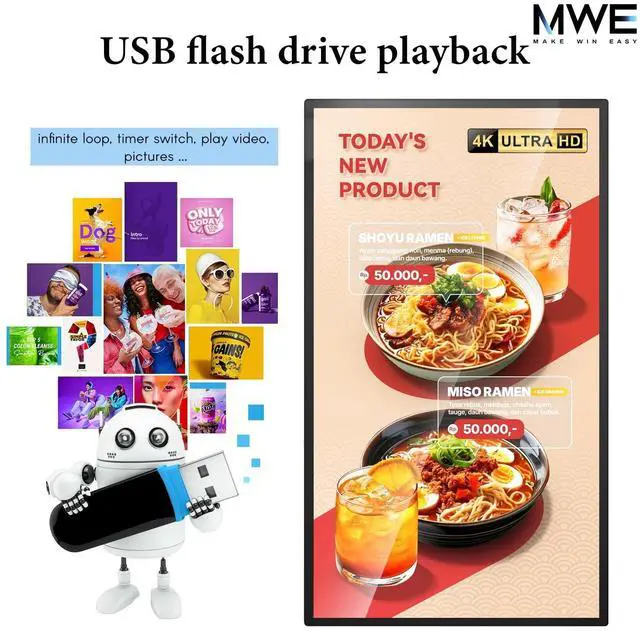 32-inch LCD Touchscreen Monitor FHDMWE Digital Signage has 1920*1080 FHD screen resolution, 10-point capacitive touch (PCAP), 350nits brightness and 1200:1 high contrast ratio, presenting a clear, vivid picture with accurate reproduction of both colors and details to meet the visual needs of various scenarios ^^ Powerful system performanceMWE Wall Mount Digital Signage is equipped with Android system, 2+16GB storage combination, running smoothly, and you can freely download all kinds of applications. It also supports wired connection to Windows system ^^ Multi-functional SupportThis Touchscreen Monitor made by MWE supports U disk plug-and-play and copy playback, convenient and fast file sharing; supports HDMI input source display, easy to connect to a variety of devices; also supports the installation of our CMS real-time information distribution system control, to meet the needs of diversified information display ^^ Commercial DesignSupport 7*24 hours of commercial use, durable, stable and reliable, MWE Commercial Display is the ideal choice for commercial display, public area information dissemination and other scenarios; at the same time, support timer on/off settings, energy saving and worry-free ^^ Convenient InstallationMWE Digital Signage supports wall-mounted, standing, hanging, embedded and other installation methods.