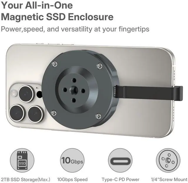 Perfect for Vlogging & Filmmaking Designed with creators in mind, this magnetic SSD enclosure is ideal for expanding storage during video shoots, whether you're vlogging, shooting microfilms, or creating content on the go. ^^ Effortless Magnetic Attachment Easily attach to iPhones or cases with magnetic compatibility for a secure, hands-free experience, ideal for mobile filming setups. ^^ Compatible with Android Devices Includes a complimentary metal ring for Android devices, enabling magnetic attachment and ensuring stability during shoots or file transfers. ^^ 10Gbps Ultra-Fast Data Speeds Enjoy rapid file transfers with a USB-C interface that supports up to 10Gbps, ensuring smooth and efficient data management for work or play.