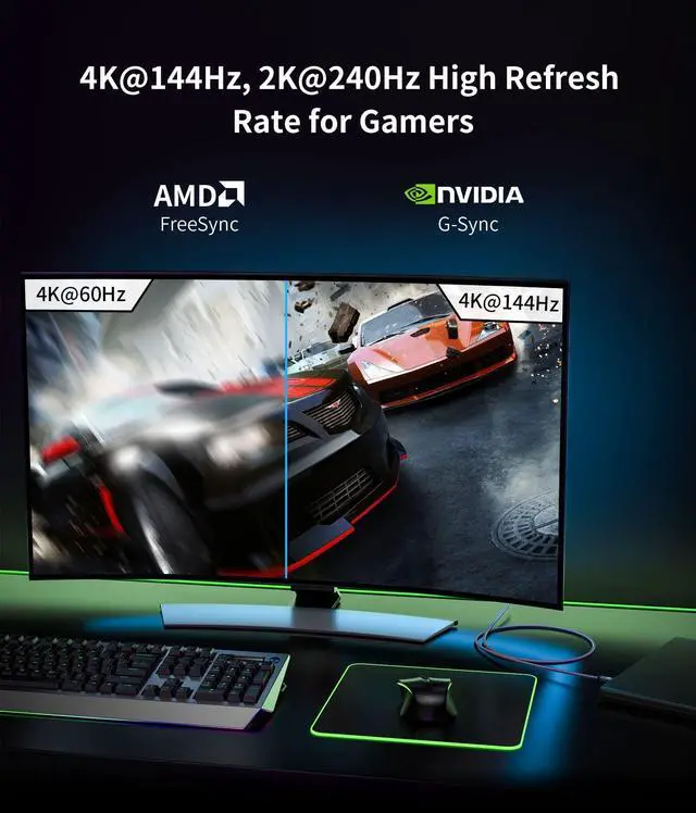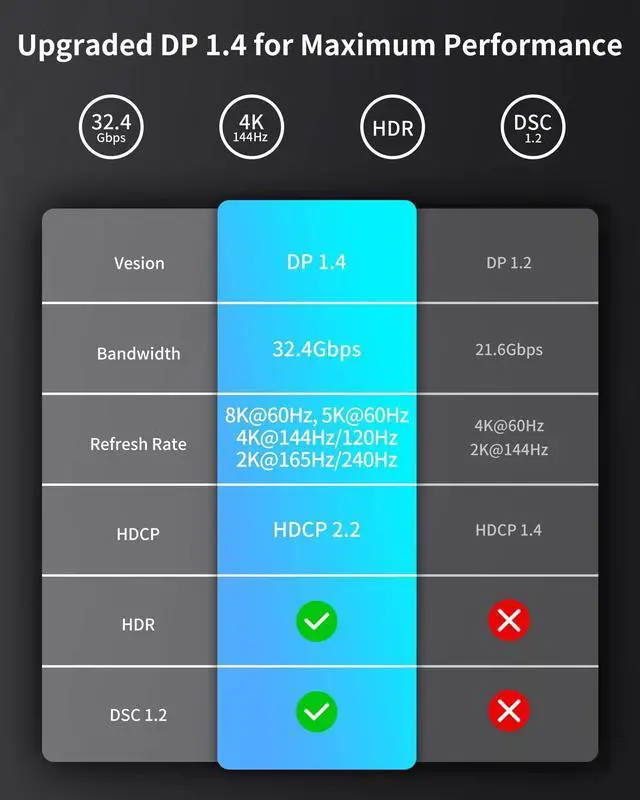 Thunderbolt 4/3 to DisplayPortSilkland (VESA Member) USB C to DisplayPort 1.4 cable supports 8K@60Hz, 5K (5120x2880) @60Hz, 5120x1440@120Hz, 4K@240Hz/144Hz, 2K@240Hz/165Hz. The Thunderbolt to Displayport cable supports Multi-Stream (MST) for daisy chaining 4 monitors (1080P) which means you can achieve the flexibility of having several displays for work or entertainment. No driver needed, plug and play. *Unidirectional transmission from USB-C host devices to DP displays exclusively. ^^ DP 1.4 Outstanding PerformanceTotal bandwidth of High Bit Rate 3 (HBR3), Transmits data at speeds up to 32.4G bps. Supports DSC, FEC, Dynamic HDR, HDCP 2.2 / 1.4.