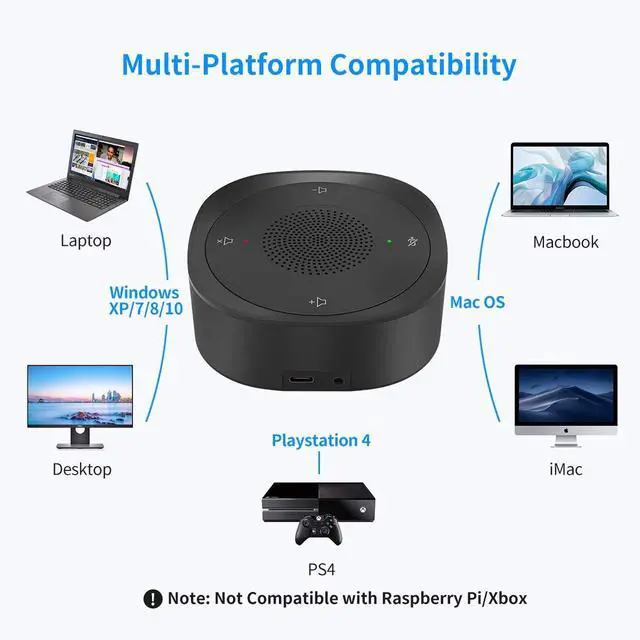 Excellent Audio quality - The condenser microphone can pick up voice from 360omni-directionoffers crystal clear voice during one-to-one conversations or group conference calls. ^^ Multi-function use - This USB microphone is both a microphone and speaker for your PC, Suitable for office conference, Skype, Online meeting, Creating podcasts and negotiation, Gaming, Video/audio chatting, and other VoIP calls. ^^ Convenient touch-sensor buttons - Quickly mute/unmute the microphone, and the volume control button allows you to easily adjust the speaker's output volume. ^^ USB Plug&Play - No drivers to install, easily connected to your PC computer, Laptop, and compatible with systems like Windows XP/Vista/7/8/10, Mac OS, etc( Not support Raspberry Pi/Android) ^^ Dual-Capsule Design- Provide a larger pick-up range and clear sound.