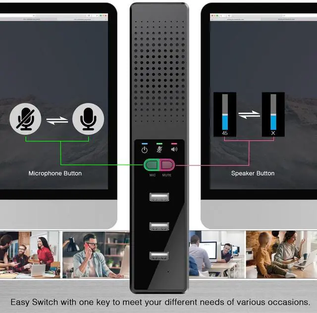 The pc speaker with microphone is characterized by a wide range of sound field, powerful low frequency, clear high frequency, etc. The speaker microphone computer enables a great listening experience and enhances movie enjoyment with its high definition stereo sound. ^^ 360 Omnidirectional Voice PickupThe conference speaker features a 360omnidirectional Voice Pickup function that is equipped with 4x microphones array and intelligent Hi-Fi speakers. It can pick up clear audio up to 16ft range and amplify sound, providing a richer and fuller sound compared to regular speakers. This ensures that all 5-6 participants sitting in various corners of a large conference room can hear every single word without missing any details.