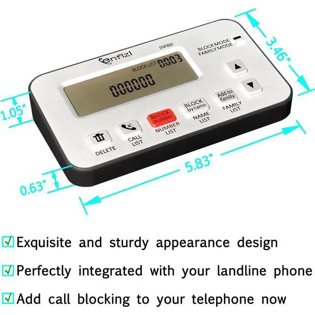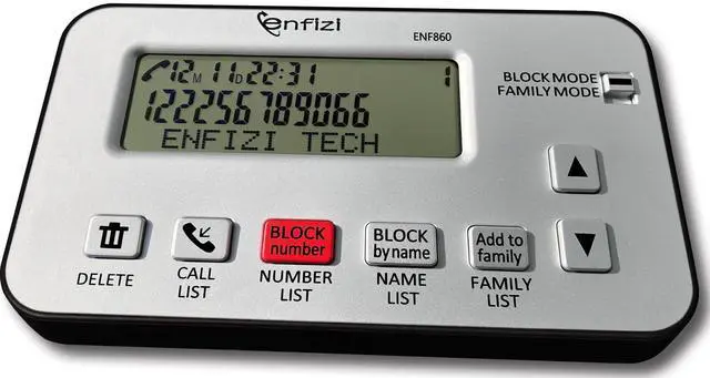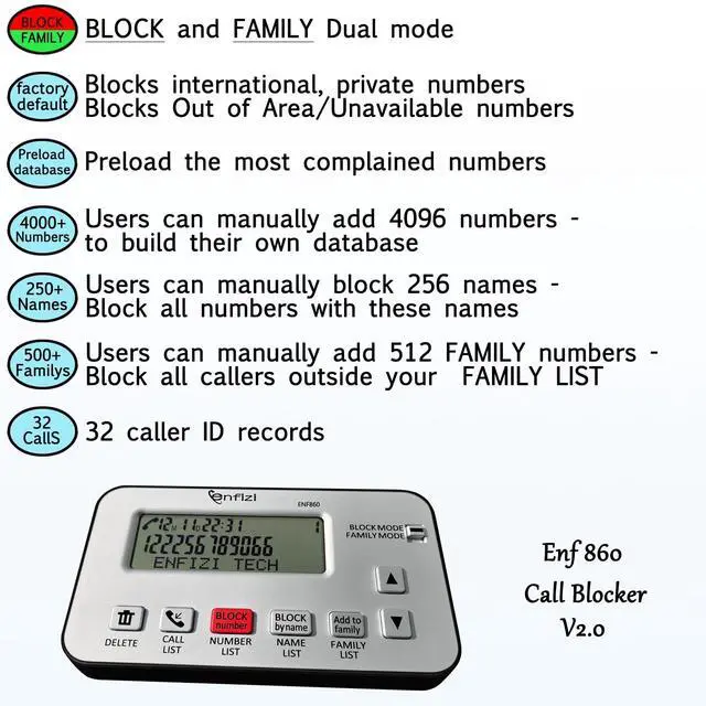 [ IMPORTANT NOTE 1 ] This product is a call blocker only and does not have a telephone or answering machine function. No phone or answering machine is included in the package. Before purchasing, please make sure that your telephone line has Caller ID service and that it is an ANALOG line. the ENF860 requires Caller ID service from your telephone line provider to work and is for analog lines only! No mains power required, just plug in the phone line to use ^^ [ IMPORTANT NOTE 2 ] In BLOCK mode, there will STILL BE some new variant numbers bypassing the database making the phone ring, you NEED to manually set up to block them OR switch to FAMILY mode to let only the numbers in FAMILY LIST through.