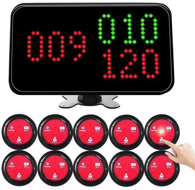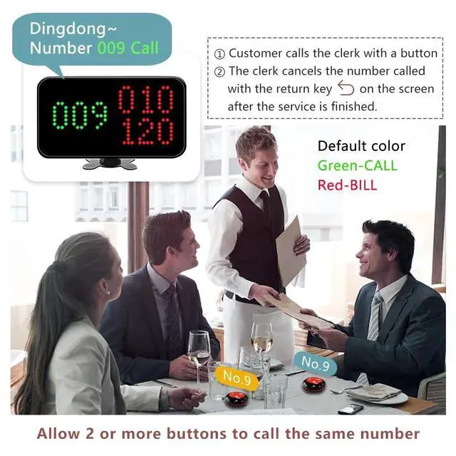 Note: Fully extend the antenna for the most optimal signal range. Install the table call system on or near metal walls surface will affect the signal range significantly. How this restaurant call button system works? 1-Customer press the call button when need service; 2-The calling number will show on the display accompany with broadcast voice; 3-The waiter will walk to the table that is calling; 4-Then press the CANCEL key after finishing service.