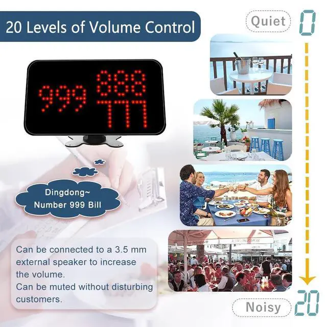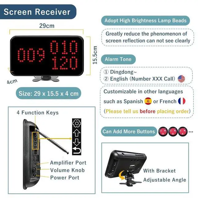 Broadcast voice: Number XXX CALL (Default, but can modify)6. Display panel can be wall mounted or place on table top. 7. Plug 3.5 mm audio cable into external speaker port for higher volume. 8.