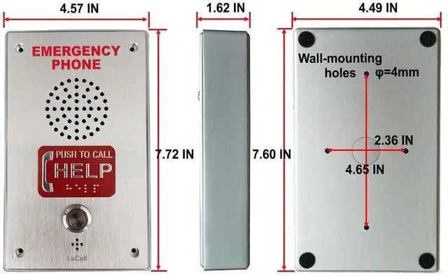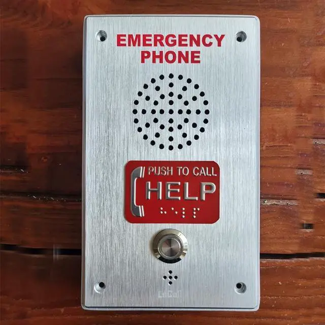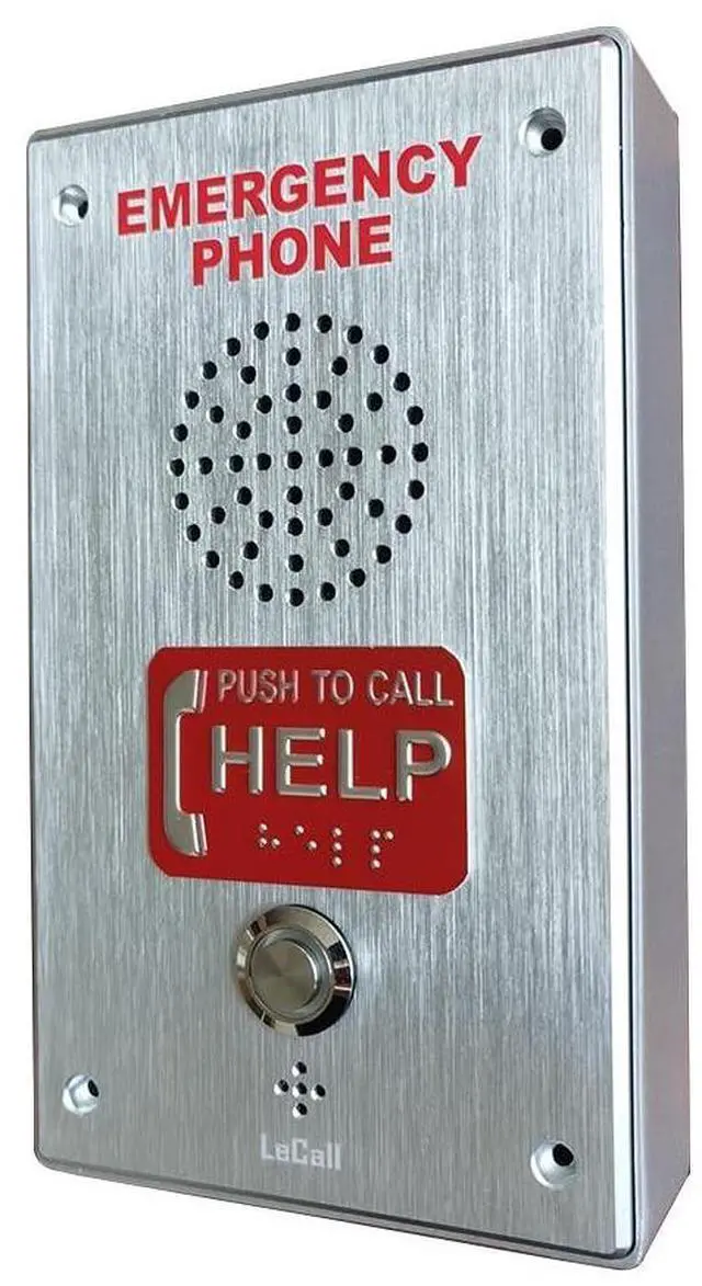 Enhance safety and emergency preparedness with this professional-grade LeCAll Emergency Phone system. Featuring a robust brushed stainless steel construction, this wall-mounted unit provides reliable emergency communication when needed. The clear, high-visibility 'EMERGENCY PHONE' marking and illuminated push-to-call button make it easily identifiable in critical situations. Built with accessibility in mind, this unit includes voice announcement capabilities and is ADA compliant, ensuring it serves all users effectively. The auto-dial feature connects directly to 911 or programmed emergency numbers with a single push. The durable speakerphone design includes a perforated speaker grille for clear audio communication.