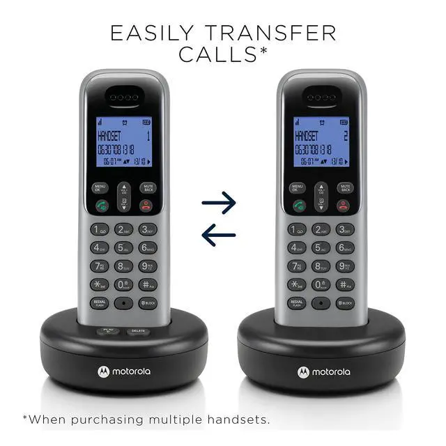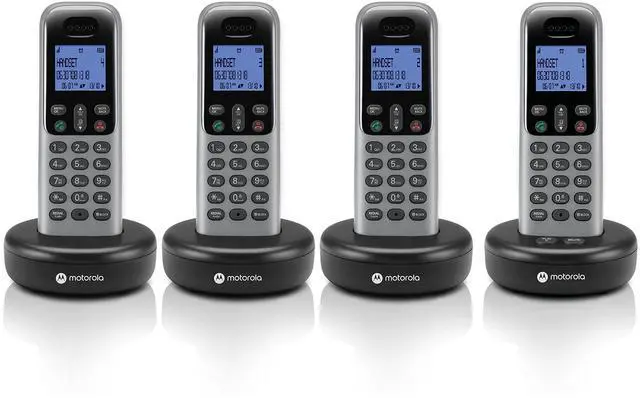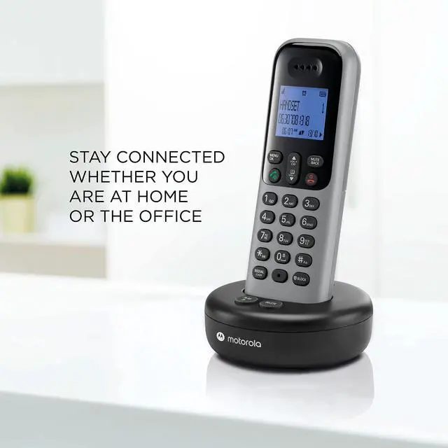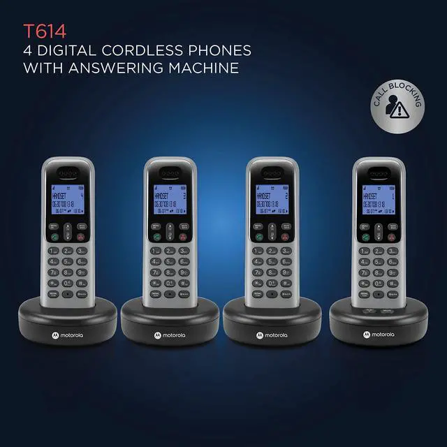 Work or Home Phone - T614 is a dark grey cordless phone system with built in answering machine ideal for both office spaces and home use ^^ Hands-Free Conversations - Cordless phone combo features hands-free speakerphone so you can take calls without a handset and multi-task while in meetings or talking with friends ^^ Multiple Contact Phonebook - Telephone system holds up to 100 entries and includes convenient built-in answering machine to take messages when you're unavailable ^^ Bright Lighted Display - Phone features caller ID, advanced call blocking to keep unwanted calls away, and easy-to-read backlit displays ^^ Includes - Four (4) cordless handsets with base, eight (8) rechargeable batteries, four (4) power adapters, setup guide