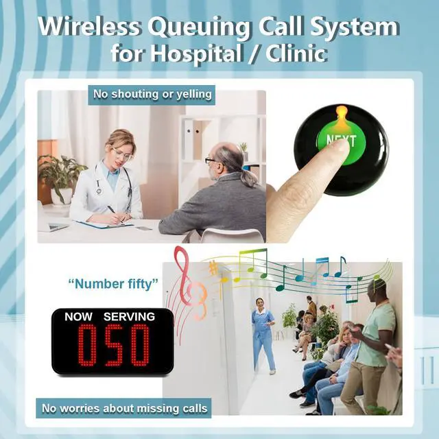 Number calling system has a wide range of applications: Restaurant, coffee shop, fast food chain, food court, pub, service centre, clinic, government offices, supermarket or pharmacies, retail, patient waiting areas other queue and noisy occasions where queuing is required, greatly improving work efficiency. No need to stand and wait in line, customers can take a break while queuing without having to worry about waiting in a long line. How Does the Number Calling System Work? 1. Customers go to the service center and take a ticket at the red number dispenser. 2. Customers wait in the waiting area for service. 3. When it is their turn, the counter staff will call by pressing the NEXT button. 4. The customer's number is displayed on the screen with a tone to prompt the customer go to counter. --Plug and play, no wiring and expense required, it is ready to use when connected to the power supply. --It is easy to call the next number directly with one click. --Durable ABS plastic casing and won't take up much space in the bank or clinic front desk.