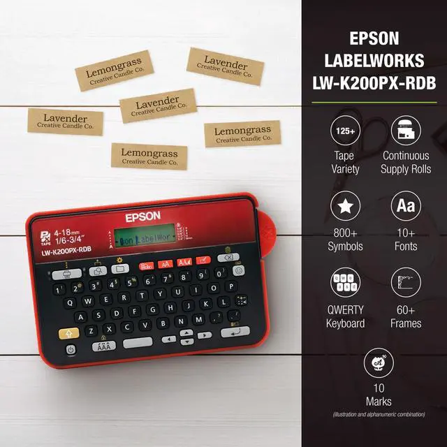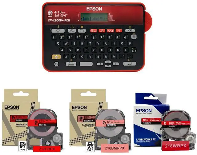 Introducing the Vibrant Crafters' Delight Bundle! Craft, organize, and personalize with the Epson LW-K200PX-RDB Label Maker featuring a Qwerty keyboard. This dynamic bundle includes PET Tape Cartridges in Matte Red, Fluorescent Red, and White on Red for eye-catching labels. Portable and user-friendly, this bundle elevates your crafting experience. Effortlessly customize labels with the Epson Label Editor Mobile app, ensuring high-resolution prints for bold and vibrant projects. Perfect for those who seek a professional touch in their crafting endeavors.
