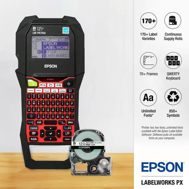 The LABELWORKS LW-PX700 industrial label maker kit comes with the LW-PX700 label printer, an AC adapter, a cartridge of 212BWPX standard industrial tape, and a guide. The LW-PX700 is a portable label and wire marker printer with exclusive time- and cost-saving features for creating custom and compliant labels up to 1 (24mm) wide. Organize tool cribs, identify storage bins, make safety labels, mark cables and wires, tag assets and more. With application-specific hot keys, this easy-to-use label maker offers extraordinary flexibility. Import images and print on the go the LW-PX700 features Mixed-Length printing for variable length labels on a single half-cut strip and Pick-and-Print for faster print-and-apply in the field.