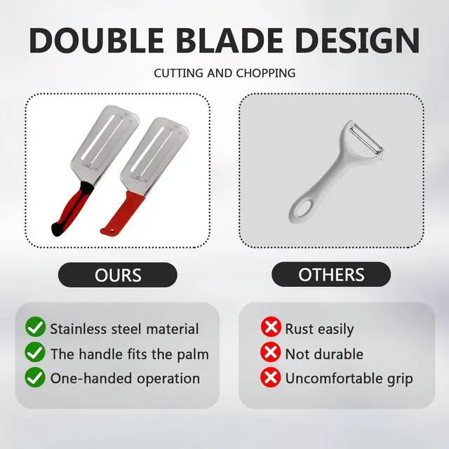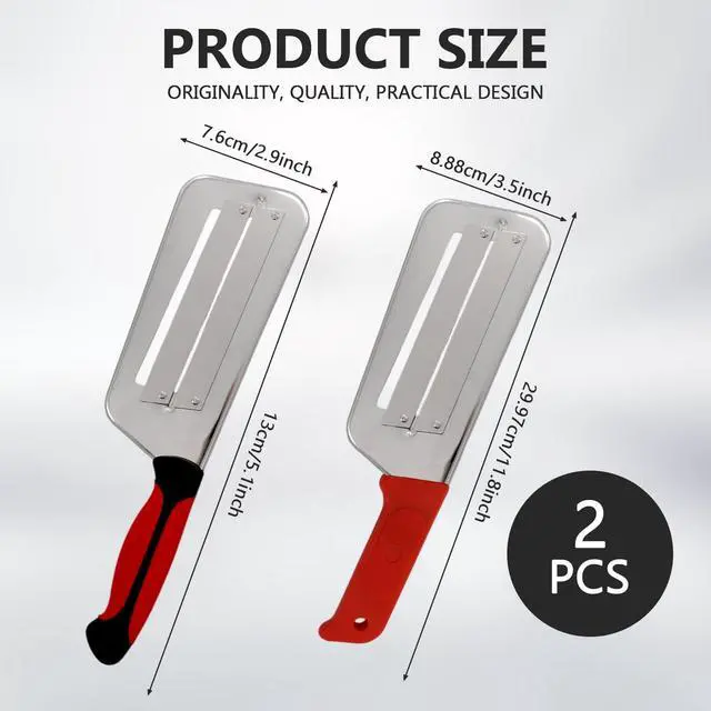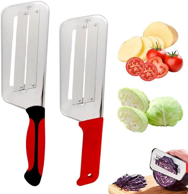 * 3.5 inPackage contents: 2 Pcs Stainless steel shredder knife(1 Red and black handle + 1 red handle)Feature: 1. Upgrade your kitchen with the Stainless Steel Cabbage Shredder, a multifunctional vegetable julienne cutter that brings convenience and efficiency to your meal preparation. 2. The dual-layer slicer design allows for uniform and precise cuts, saving you time and effort in the kitchen. 3. Made from high-quality stainless steel, this japanese cabbage shredder is built to last, offering durability and sharpness that won't dull over time. 4. Its lightweight and easy-to-use design make it a cost-effective and practical addition to your kitchen. Plus, the easy-to-clean feature ensures that your tool stays in top condition, ready for your next culinary adventure. 5. Whether you're preparing a fresh salad, coleslaw, or a hearty stir-fry, this cabbage shredder is your go-to solution.