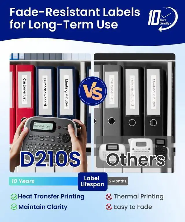 labeling every time ^^: Use the included Type-C cable for eco-friendly, cost-effective printing (charger not included) or 6 AAA batteries for ultimate portability ^^: Our label makers heat transfer waterproof labels last 10+ years vs. 2 months with standard thermal labels! Fade-resistant and ultra-durable for permanent, professional results ^^