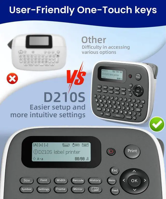 Perfect for indoor/outdoor use ^^: VolenGo D210s label maker machine with tapes boosts creativity with 800+ symbols, 100+ frames, 16 fonts & 9 barcode options. Print multi-line labels even in tight spaces! ^^ -: VolenGo D210s Label Maker simplifies labeling with easy setup, -friendly menus, intuitive controls, and one-touch smart keys for tape! Effortless every time ^^ -