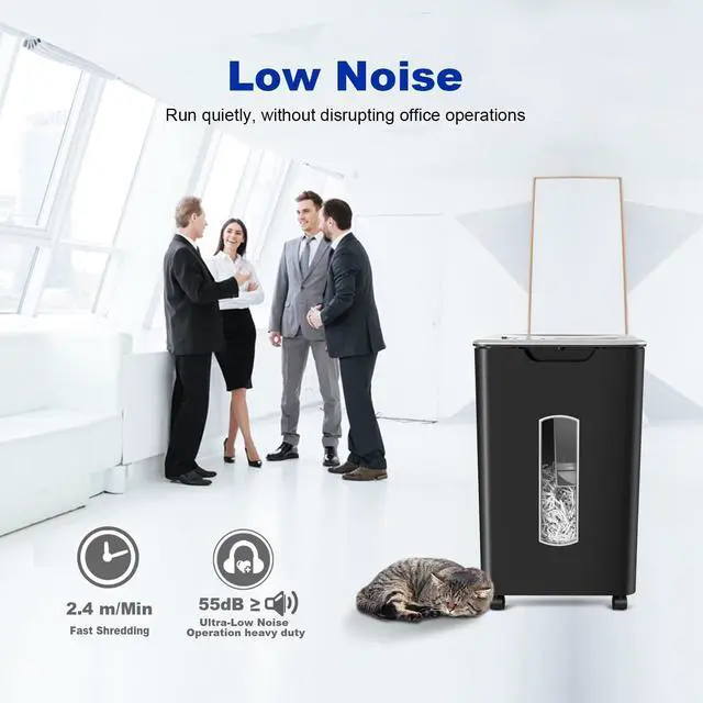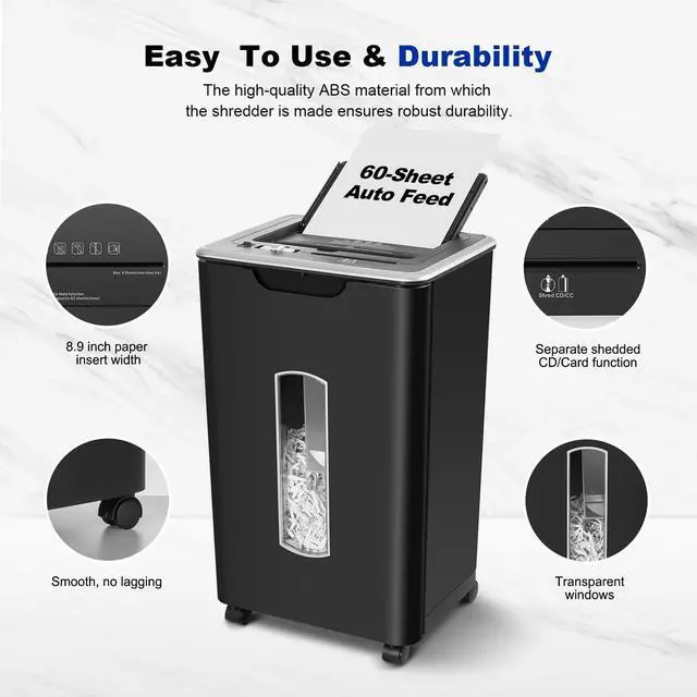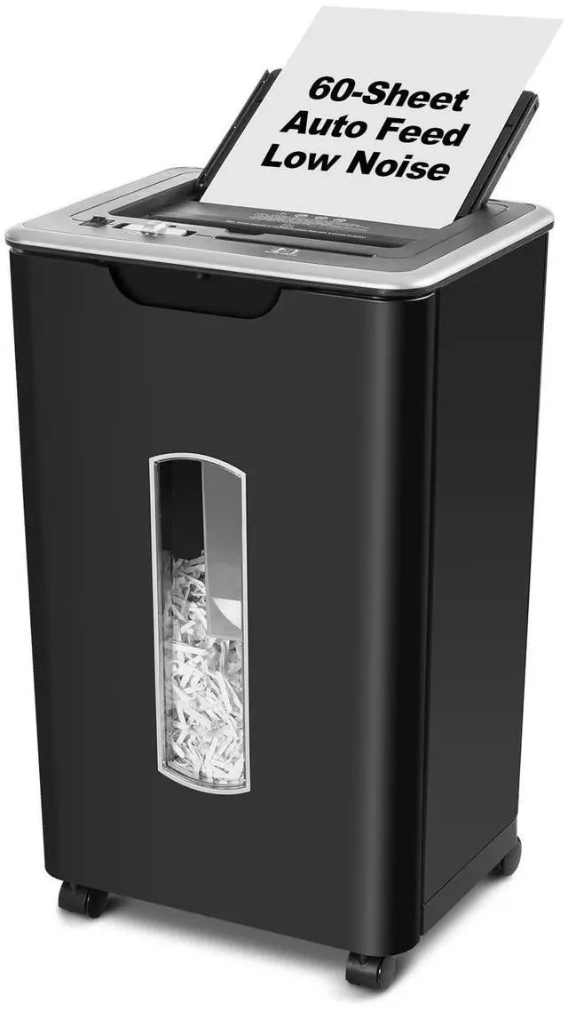60-Sheet Auto Feed & Dual Shredding ModesEffortlessly shred up to 60 sheets automatically or switch to manual mode for smaller tasks. Perfect for handling large volumes of documents with ease. ^^ Whisper-Quiet Operation at 55dBDesigned for a peaceful workspace, this shredder operates at just 55dB, making it one of the quietest shredders on the market. Ideal for home offices or shared spaces. ^^ P-4 Cross-Cut SecurityThis P-4 cross-cut shredder turns documents into tiny 4 x 36mm particles, providing enhanced security for sensitive information. It can handle staples, ensuring thorough shredding.