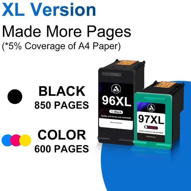 High Page Yield: Up to 850 pages per 96XL Black Ink Cartridge and 600 pages per 97XL Color Ink Cartridge5% coverage