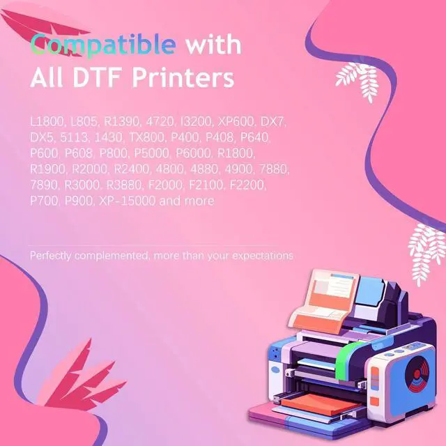 Compatible Printer: Refill for DTF printer with printhead ET Head L1800 L805 R1390 4720 I3200 XP600 DX7 DX5 5113 1430 TX800 P400 P408 P640 P600 P608 P800 P5000 P6000 R1800 R1900 R2000 R2400 4800 4880 8500 8550 4900 7880 7890 R3000 R3880 F2000 F2100 F2200 P700 P900 XP-15000 L801 L800 L850 T50 T60 R290 RX610 690 R200 R210 R220 R300 R310 R340 R350 and more ^^