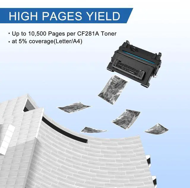 Page Yield: 10, 500 pages per 81A CF281A black toner cartridge (Letter/A4, at 5% coverage) ^^ Our 81A 81X CF281A CF281X toner cartrigde give you consistent, vibrant colours and crisp prints.