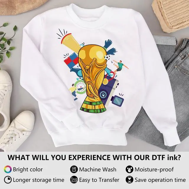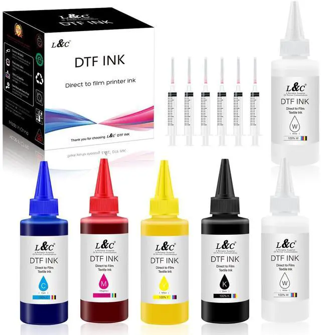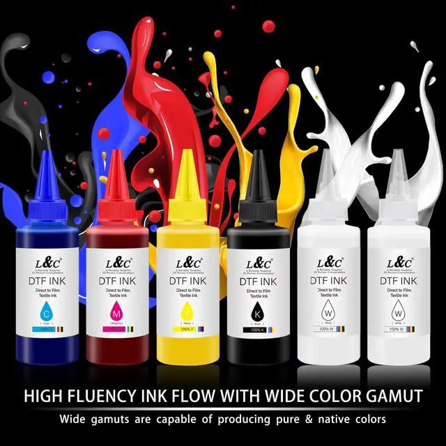 Professional interface: Special for interface, The unique spout design of DTF ink makes refill ink easier. ^^ TOP QUALITY The colors turn out fantastic, and they are washable and does not fade easily. They are best used together with our DTF transfer film warm or cold peel and DTF powder ^^ Package include 6 bottles 100ml DTF ink1*Cyan, 1*Magenta, 1*Yellow, 1*Black, 2*White ^^ ITS RISK-FREE! - The L&C brand promise is; we are not happy until our customers are happy. Regarding DTF printing, we can provide technical support for free, and you can also directly customize the DTF transfer film.