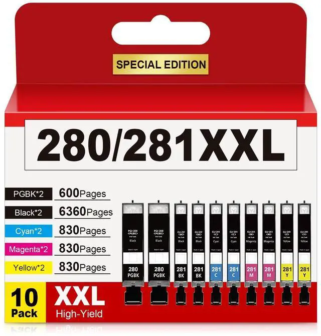 What's in the box: 2 New Extra Capacity Cartridge 280 281 pack of 5 ink cartridges: 2 PGBK 280XXL ink cartridge, 2 Small Black 281XXL, 2 Cyan 281XXL, 2 Magenta 281XXL, 2 Yellow 281XXL (NOT Include Photo Blue, Total 10 Packs), and a user guide ^^ The 280XL 281XL ink cartridges work with: TR8620a TR8620 TS9520 TS9521C TR8622 TR8520 TR8500 TR7620 TR7520 TR7500 TS6100 TS6120 TS6200 TS6220 TS6300 TS6320 TS702 TS702a TS8100 TS8120 TS8200 TS8220 TS8222 TS8300 TS8320 TS8320 TS8322 TS9100 TS9120 Printers ^^ Designed specifically for Canon printers, all Relcolor cartridges are engineered with the latest upgraded chips, more incompatibilities are blocked