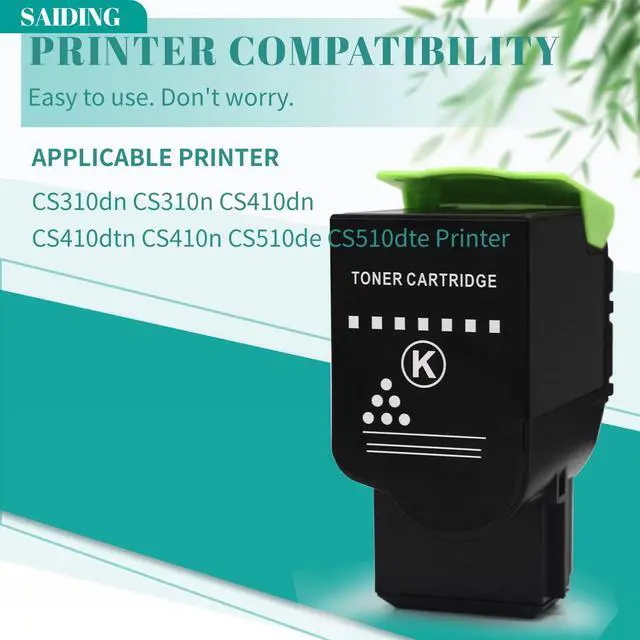 Compatible printer: For CS310dn CS310n CS410dn CS410dtn CS410n CS510de CS510dte CS310dn CS310n CS410dn CS410dtn CS410n CS510de CS510dte printer. In order to prevent you from buying the wrong model, please refer to the product description and compatibility of the printer model before buying ^^ CS310 Black Toner Cartridge OEM Number: 701HK. 70C1HK0. Saiding adopts advanced technology, and the durability, durability and stability of Saiding are far ahead in the industry. Produce clear images and high-gloss printing effects, and strictly manage them to ensure stable ^^ CS310 Black Toner Cartridge Estimated page high yield: up to 4, 000 pages depends on printer and usage at 5% coverage. The page output is high, the printing effect is good ^^ CS310 Black Toner Cartridge SAIDING service: We are committed to providing our customers with possible experiences. If you are dissatisfied with the products and the products you receive are defective or damaged, please email us and we will provide you with solutions ^^ CS310 Black Toner Cartridge Printing Available places: Our toner cartridges are developed by a professional team, with bright colors and sharp edges, specially designed for printers, and we will ensure that they are delivered to you in perfect condition, this product can be used in schools, hospitals, offices, homes, clinics, post offices, banks and other places ^^ CS310 Black Toner Cartridge Easy to install: Our toner cartridge is designed to be easy to install and use. When installing the toner cartridge, you must first open the toner cartridge installation opening corresponding to the printer, take out the old toner cartridge, and put the new compatible toner cartridge into the corresponding position smoothly. After closing the hatch, it may be necessary to perform some initialization or calibration operations according to the printer's prompt, so that the new toner cartridge can be accurately identified and used normally ^^ CS310 Black Toner Cartridge Manufacturing conditions: Toner cartridges are manufactured in ISO9001 and ISO40001 certified manufacturing facilities. No harm to machines, SAIDING always adhere to good printing consumables. Each SAIDING cartridge has been carefully tested on different models, so it works perfectly with the printer ^^