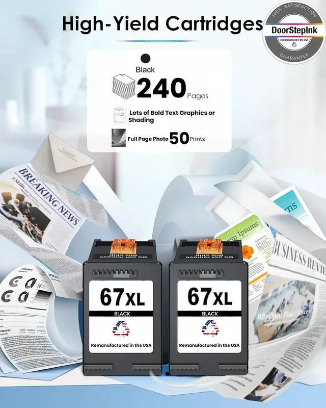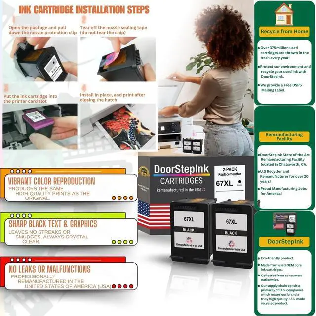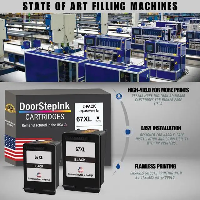^^: Each DoorStepInk printer cartridge is remanufactured in the USA using original HP components, delivering reliable performance that rivals OEM products. Compatible with HP 67XL black ink cartridge models, they are tested for printer ink quality and page yield. Suitable for black ink and color printer outputs, our ink 67 xl replacements help cut the cost of hp printer ink 67XL without compromising ink master level quality. Use with popular ink jet printer models.