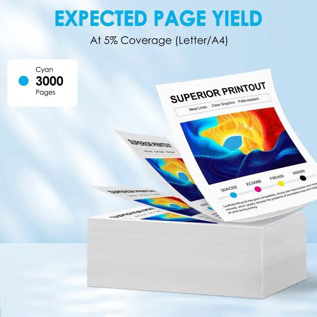 High Page Yield: 3, 000 pages per Cyan, at 5 percent Coverage of A4 letter.