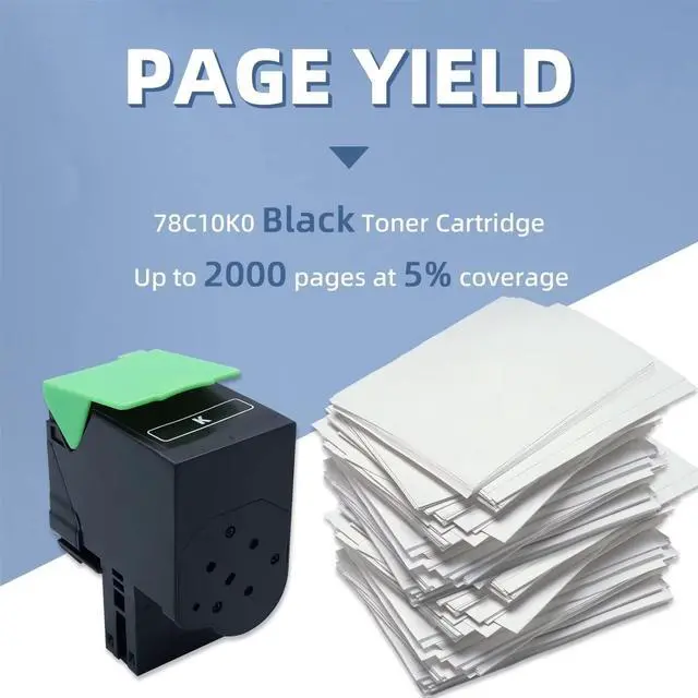 ^^ PAGE YIELD: 78C10K0 toner cartridge is up to 2000 pages per cartridge at 5% coverage. The powder is uniform and fine, text and graphics print crisp.