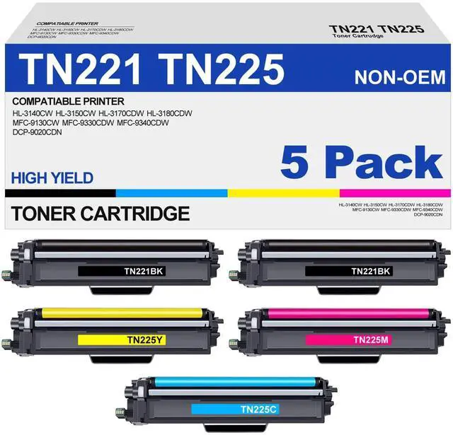 Packing List: 2 x TN221 Black, 1 x TN225 Cyan, 1 x TN225 Magenta, 1 x TN225 Yellow (Total 5 Pack).