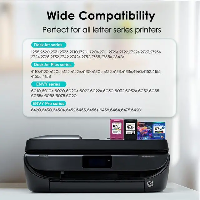 ^^ Wide Compatibility: Eco Victor for hp ink 67xl black and color combo pack compatible for HP ENVY 6010 6010e 6020 6020e 6022 6022e 6030 6032 6032e 6052 6055 6055e 6058 6075 6420 6400 6430 6430e 6452 6455 6455e 6458 6464 6475 Printer and HP DeskJet 1255 2320 2331 2333 2710 2720 2720e 2721 2721e 2722 2722e 2723 2723e 2724 2725 2732 2742 2742e 2752 2755 2755e 2842e 2855e 2821e 2823e 2827e 4100 4110 4120 4120e 4121 4121e 4122 4122e 4130 4130e 4132 4133 4133e 4140 4152 4155 4155e 4158 4255e Printer.