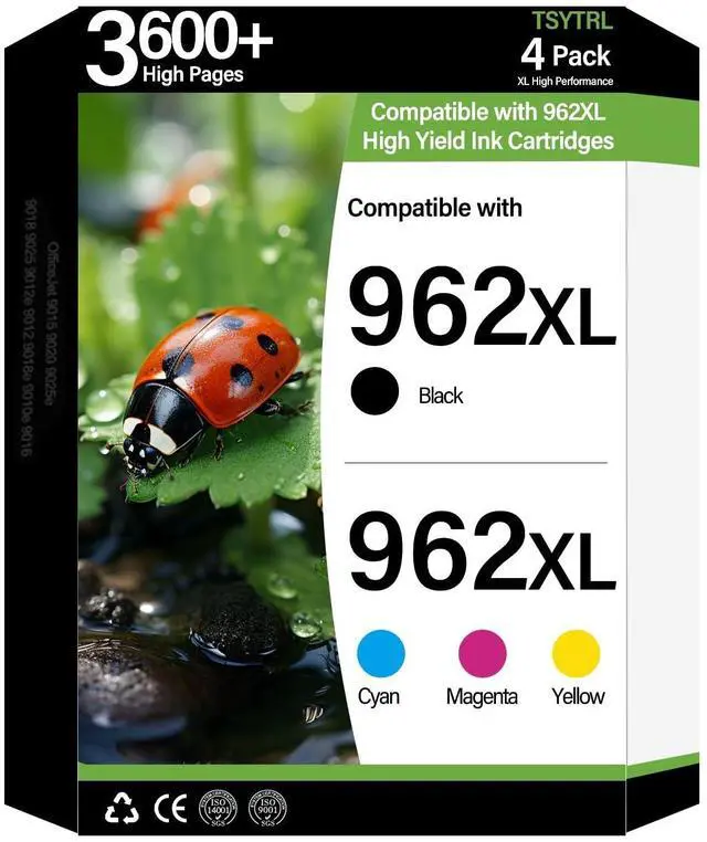 962 Original Quality & 50%-Cost SavingSave 50% with Tsytrl's remanufactured 962XL ink cartridge combo pack! Delivering identical print quality to original ink cartridges at half the cost, our printer ink is perfect for home offices, students, and small businesses looking for affordable printing solutions. ^^ 962XL Large Capacity to Print More PagesExperience exceptional printing capacity with up to 2000 pages from black and 1600 pages from color ink cartridges (5% coverage on A4). Our high-capacity HP 962XL ink cartridges deliver reliable performance for all your printing needs. ^^ Wide Compatibility with HP PrintersRemanufactured 962XL ink cartridges combo pack replacement for HP ink 962 are compatible with