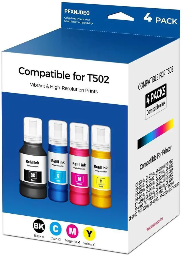 Higher Compatibility: compatible for T502 ink refill bottles 4 pack compatible for ET 2850 ink refill, ET 3850 ink refill, ET 4850 ink refill, ET 15000 ink refill, ET 2980 ink refill, ET 3843 ink refill, ET 3830 ink refill, ET 3760 ink refill, ET-2760 ink refill, ET-2988 ink refill, ET-3943 ink refill, ET-2850 ink, ET-3850 ink, ET-4850 ink, ET-15000 ink, ET-2980 ink, ET-3843 ink, ET-15000 ink, ET-3830 ink, ET-3760 ink, ET-2760 ink, ET2850 ink, ET3850 ink, ET4850 ink, ET15000 ink, ET2980 ink, ET3843 ink, ET3830 ink, ET3760 ink, ET2760 ink, 2850 ink, 3850 ink, 4850 ink, 15000 ink, 2980 ink, 3843 ink.
