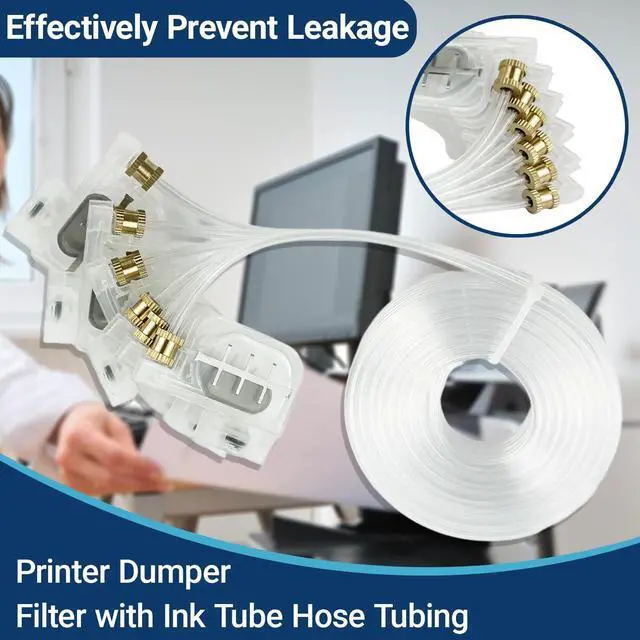 PACKING INCLUDING: 1 set include 6 pcs dampers + 1.5 meters 3mm x 2mm tube. Small connecting port. Connect the 3mm*2mm ink tube. Multiple ink tubes can be connected together with multiple dampers to form a filtration system connected with the ink cartridge.