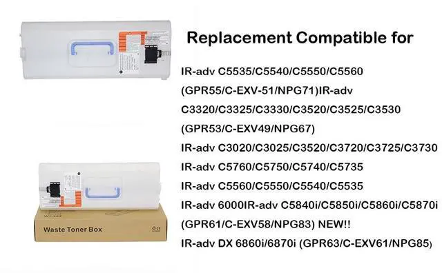 • Canon WT-202 Waste Toner Box Replacement Compatible for IR-adv C5535,C5540,C5550,C5560 (GPR55/C-EXV-51/NPG71) IR-adv C3320,C3325,C3330,C3520,C3525,C3530(GPR53/C-EXV49/NPG67) IR-adv C3020,C3025,C3520,C3720,C3725,C3730 IR-adv C5760,C5750,C5740,C5735 IR-adv C5560,C5550,C5540,C5535 IR-adv 6000IR-adv C5840i,C5850i,C5860i,C5870i (GPR61/C-EXV58/NPG83) NEW!!IR-adv DX 6860i,6870i (GPR63/C-EXV61/NPG85)