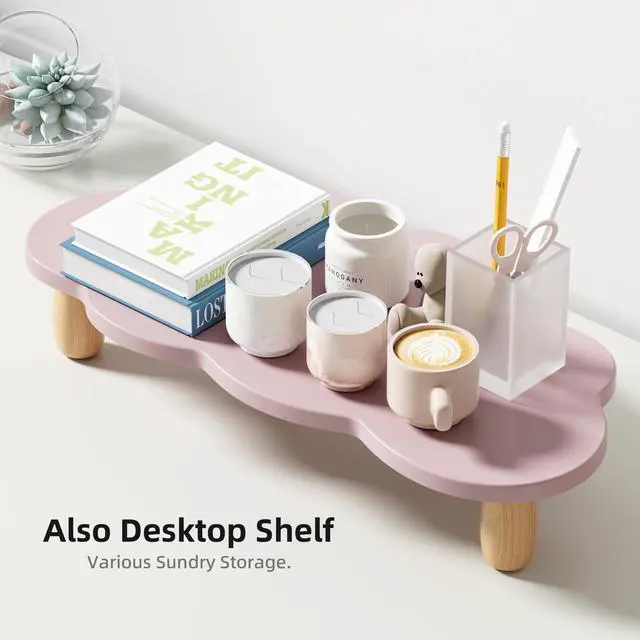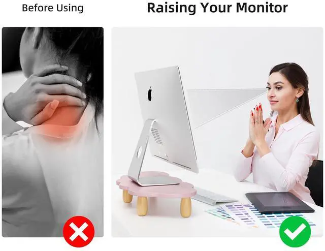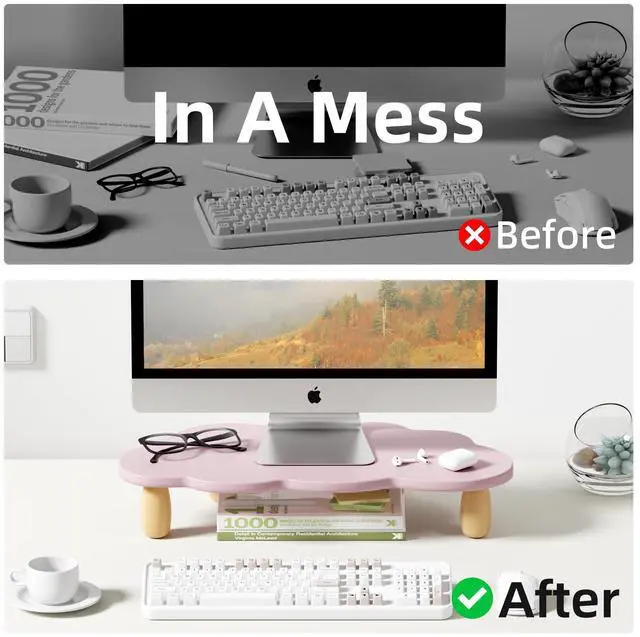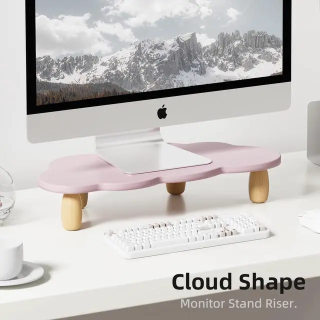 Ergonomic DesignFeatured ergonomic design, AFOOYO monitor stand raises your monitor screen to a comfortable eye level (about 3.2 inches) for relieving stress on the neck, shoulders and back, and improving work efficiency. ^^ Upgraded Exclusive DesignA cute cloud shape panel with 4 cylindrical beech feets, adds a rustic and unique look. Silicone non-slip pads are pasted on the feet to keep stable even while working. The feet and panels are finely polished, and the quality is cost-effective. ^^ Space Saving &StorageGet rid of the messy desks! It allows for organizing office supplies and accessories, adding hanging pen holders for easy access, making the work environment more efficient and tidy ^^ Heavy Duty StandDimensionL 16.5 x W 8.2 x H 3.2 inch.