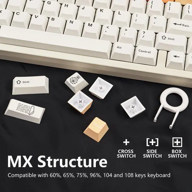 Only Keycaps: Including 130 keys pbt keycaps and a keycap puller, not include keyboard. The keyboard in pictures only to showcase