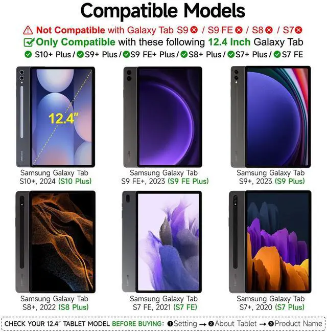 STOP - Verify Your Tablet First Won't fit Ultra/S9/S8/S7 standard sizes. Won't fit 14.6 -inch. Exclusively crafted for 12.4 Samsung Galaxy Tab S10+/S9+/S8+/S7+ & S9 FE+/S7 FE.