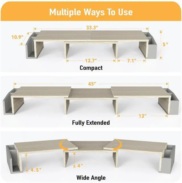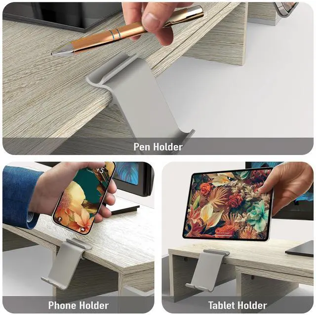 Built-In Phone & Tablet Holder - Keep your screen in sight for calls, videos, or multitasking while you work. ^^ Customizable Organizer Tray - Includes 6 removable dividers to create up to 9 compartments for pens, sticky notes, and small supplies. ^^ Side Caddies for Extra Storage - Ideal for holding office tools, cables, or personal items within arm's reach. ^^ Ergonomic Monitor Riser - Elevates your monitor or laptop to reduce neck and eye strain for all-day comfort. ^^ Compact Dimensions - 10.9"D x 33.3"W x 5"H. ^^ Fully Extended Dimensions - 10.9"D x 45"W x 5"H.