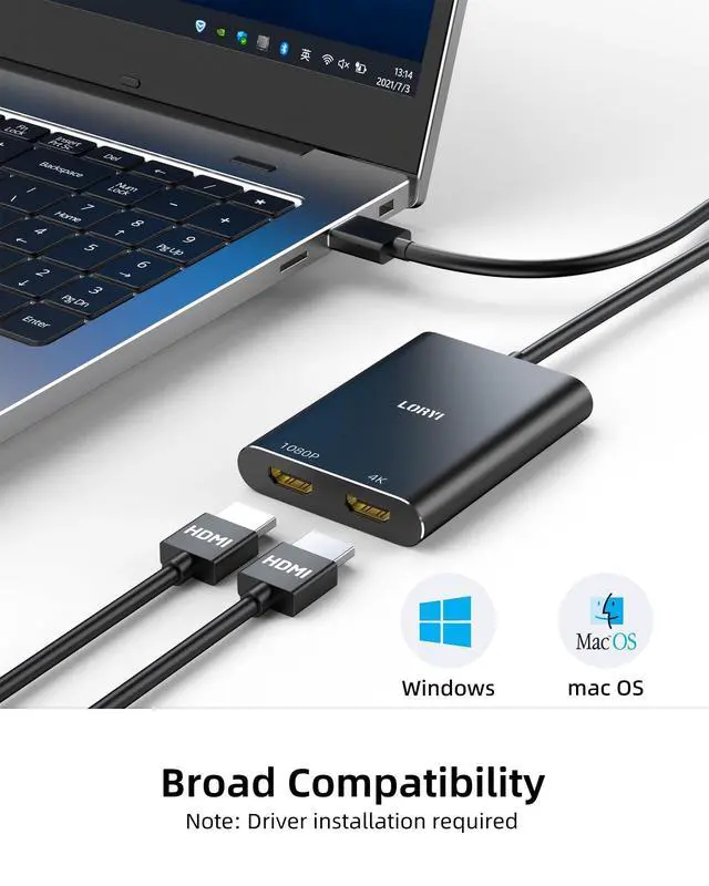 ^^ FHD High Resolution: The two HDMI ports on the USB to HDMI converter can be extended simultaneously, with Port 1 supporting resolutions up to 4K@30Hz and Port 2 supporting up to 1080P@60Hz. The USB to HDMI adapter with full HD video resolution is an excellent choice for practical video expansion tools.