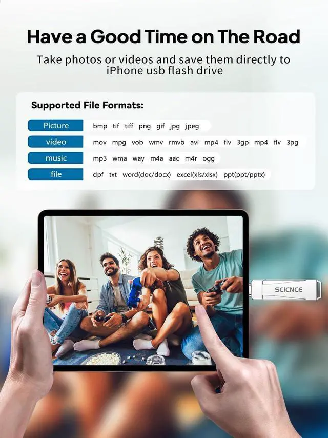 For Android smartphones: Need to open OTG function) ^^ Plug and Play, No Application Required, Instantly Increases iPhone and iPad Memory SpaceIf you almost used up all space on your iPhone or iPad, this photo stick for iPhone helps to expand your memory at full storage with 512GB. And usb memory stick for photos is also a great partner for traveling photographers editing on iPad. Using this memory device for your iPhone, iPad or Computers, no worries with the iPhone storage anymore! ^^ Watch Movies, Photos and Play Music Directly From Phone Flash DriveStore your favorite videos, audios and music on your iPhone's Photo Stick, then seamlessly plug and play on your iPhone or iPad anytime, anywhere. No more need for Internet or WiFi. This iPhone storage device plays videos in many different formats. Pictures stored on the Phone storage device also support different formats. Great way to store all your pictures and videos on an phone external storage device. ^^ High Transfer SpeedTransfer photos, videos, and files in seconds with our USB stick. With a write speed of up to 20 MB/s and a read speed of up to 30 MB/s, our flash drive for iphone have higher performance than conventional usb storage flash drive.