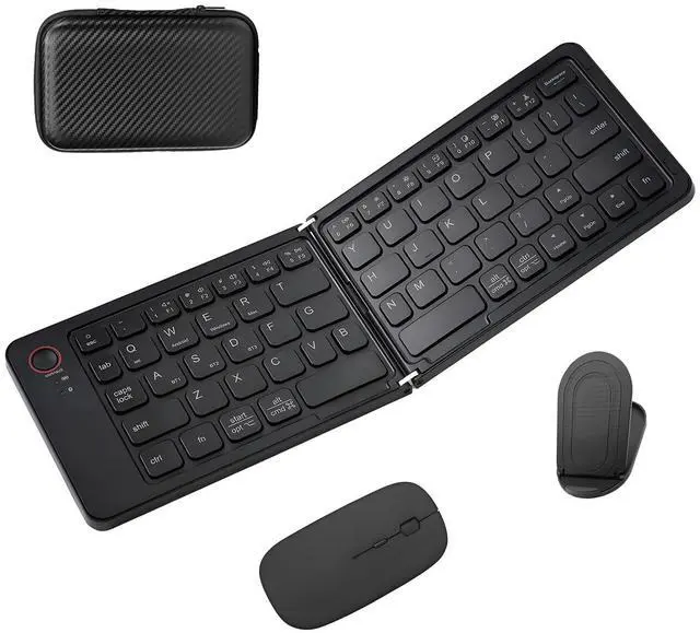 Foldable Bluetooth Keyboard and Mouse for TravelFoldable keyboard and mouse combo comes with a hard carrying case(Size: 7.1 x 4.7 x 1.6 in) to store and protect the keyboard and mouse. Designed with small size and light weight, easily carried in your backpack. Along with foldable stand holds for phone and tablets, makes it perfect for your travel or business trip. ^^ Wireless Bluetooth ConnectionWireless folding keyboard and mouse adapted bluetooth connection, you can easily connected to your tablets, iPads and phone.