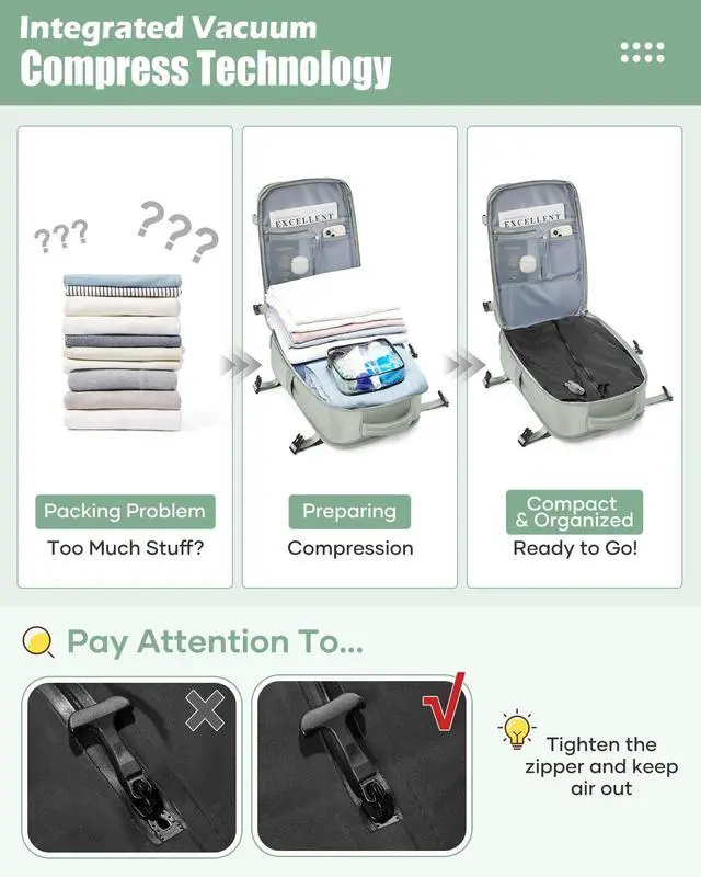 It has multiple built-in multifunctional pockets for excellent storage. There is also a hidden anti-theft zippered pocket on the back for added security. This air backpack features a multi-panel airflow design with a 3D back pad, breathable adjustable shoulder straps, and a waist belt lining to reduce shoulder and back strainThe vacuum travel backpack also comes with trolley straps to attach it to your luggage for a more convenient travel experience.