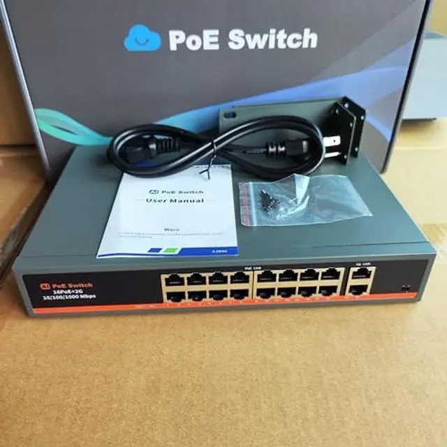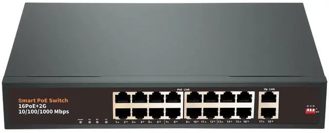 18 ports POE SwitchIncluding 16 POE+ ports(10/100Mbps), and 2 UpLink port(10/100/1000Mbps), Davuaz power over ethernet switch can transmit network data and power at the same time with IEEE 802.3 af/at standard. You can connect it to all your devices, such as Computer, Laptop, routers, IP camera, IP phone, NVRs, etc. ^^ Effective POE PowerThis gigabit switch offers a maximum 250W PoE power output in total. Support IEEE 802.3 af/at, single-port POE power up to 30W, can meet power supply requirements most of your applications. Please confirm the input voltage range: 100-240V. ^^ One Key Extend ModeWhen it is set to "E+V", the transmission distance of the poe port will be extended to 250 meters (10Mbps), providing convenience for long-distance network cameras. ^^ Port lsolation FunctionWhen it is set to "E+V", each POE port cannot be connected to each other but can only be connected to the UP Link port. With the one-key VLAN fuction, this kind of gigabit poe switch can effectively suppress network faults such as network storms, to ensure good network transmission performance and security. ^^ Plug & PlayWith power detection function, the unmanaged gigabit switch will detect devices automatically. Built-in power supply makes installation easier, you just need to plug in the power cord, and connect the ethernet cable directly to the device without other configuration. So that you can enable ultra-fast wired connectivity and instant large files transferring.