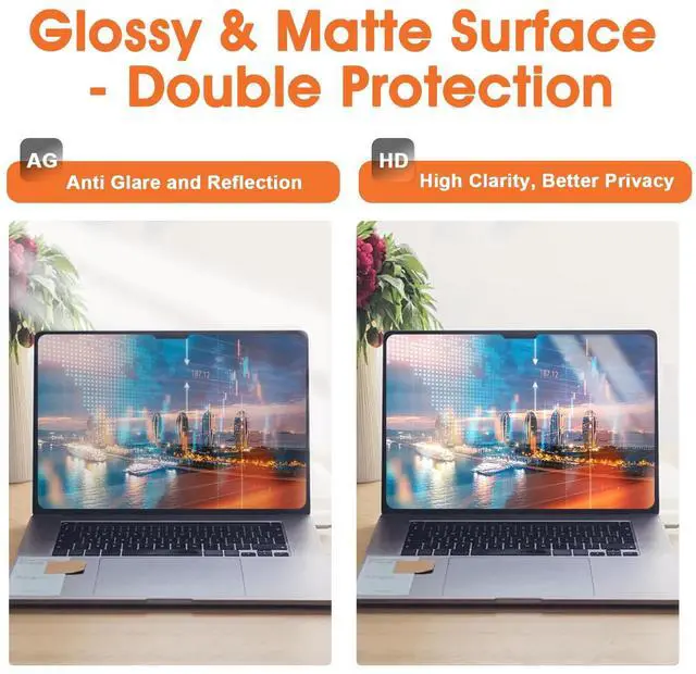 Glossy: Double protection with one matte side and one glossy side. You can use the matte side to prevent glare and reflection during the day when there is a lot of light. You can use the HD side for a clearer display at night when the light is low. Also adjust the screen brightness as needed, protect your laptop's privacy around the clock. ^^ High-Definition Viewing Experience Enjoy crystal-clear display quality with no distortion. This computer privacy screen Shield 14 inch 16:10 retains the original color accuracy and display clarity, providing a superior user experience for work, entertainment, and creative tasks. You can adjust the screen brightness to get different anti-peep effects.