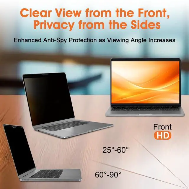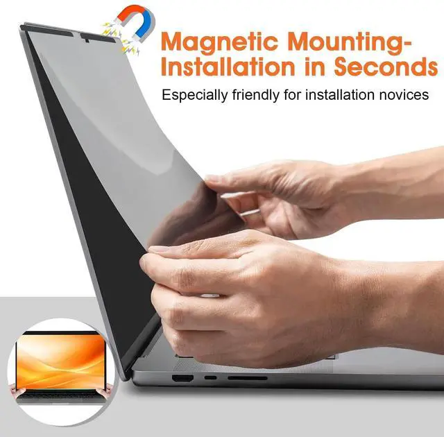 Install: 2025 BSPROTE privacy screen for laptop 14 inch features a "one-second installation" design with automatic magnetic attachment along the laptop screen top, the bottom black adhesive strip (Not cover the important contents) can fix privacy screen without falling off, hardly affects laptop closure, for effortless setup and removal. Ideal for office, travel, and on-the-go privacy needs. If you laptop has a raised bezel, there may be a slight gap in the top area of the screen, but it won't affect your to read that part of the screen.