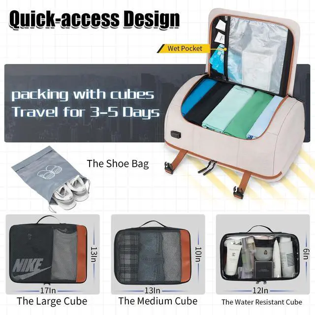 Bonus Packing Cubes: This 42L carry-on backpack includes 3 packing cubes and 1 separate shoe bag to help organize clothes, shoes, and travel gear more efficiently. The main compartment opens like a suitcase, offering large, flexible storage space for 35 days of travel. ^^