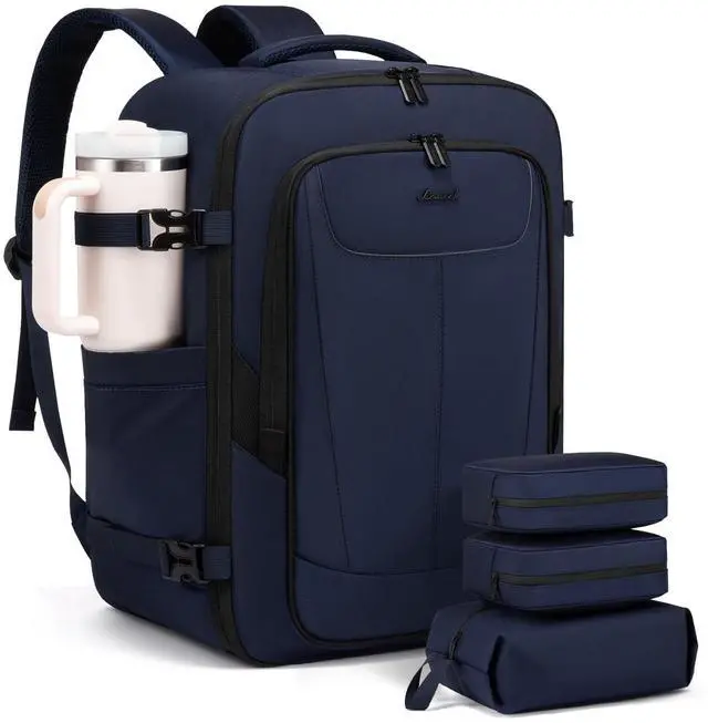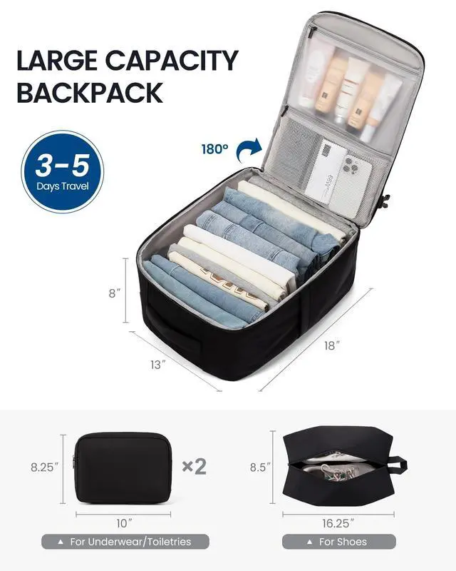 Perfect for 3-5 Days TravelYou'll receive a high-capacity travel backpack(18"13"8") plus 3 bonus packing cubesperfect for storing essentials for 3-5 days of travel, with space equivalent to a 20-inch suitcase. ^^ 180 Open DesignThe 180-degree full-open design lets you grab/pack your stuff in seconds and breeze through TSA like a pro. Good choice of personal item travel bag. ^^ TSA FriendlyThis personal item backpack fits perfectly under seat or in the overhead binmeets all major U. S. airlines' carry-on requirements! And the dedicated back-panel laptop compartment lets you quickly access your laptopperfect for airport security or on-the-go use.