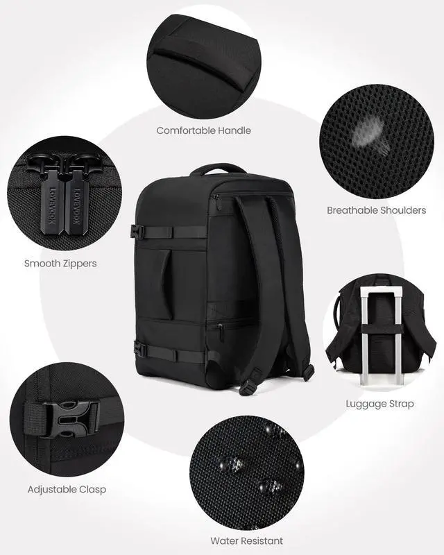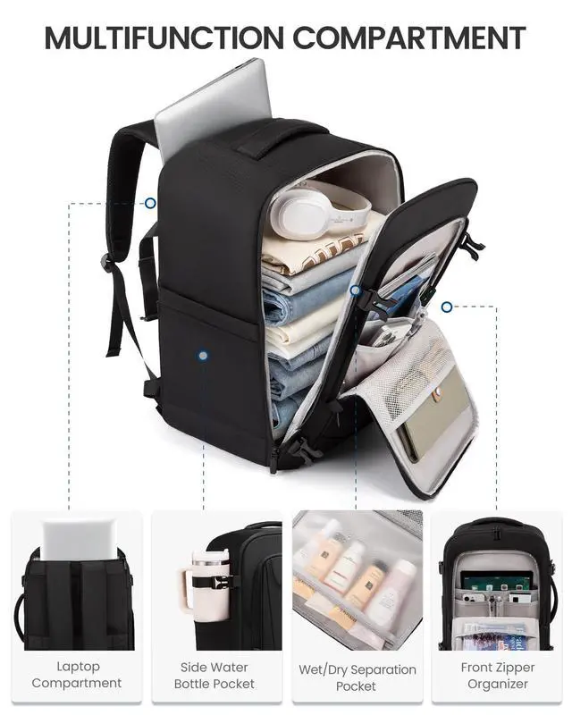 ^^ Well OrganizedThe personal item backpack features 13 pockets for efficient organization. The dedicated laptop sleeve fits up to 17.3 inch laptop, and the built-in wet/dry separation pocket stores damp towels. And it also has a back anti-theft Pocket for valuables, a side pocket for water bottle. ^^ Easy to CarryThe suitcase backpack is comfortable to carry with thick padded shoulder straps and back pading. With two handles on the top and right side and luggage strap provides you with a more flexible carrying experience. ^^ Water-resistant & DurableMade from water-resistant fabric, It keeps items dry when used in rainy day.