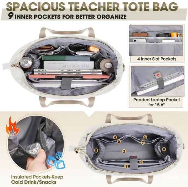 LARGE CAPACITY & MULTI-POCKETS: Spacious work bag has a total of 14 pockets, main compartment including thickened padded pocket that can accommodate a laptop( 15.6" ) and tablet, two insulated pockets keep food warm and cold and 4 slots to keep teacher bag organized. Two front zipper pockets store book or folder for easy access and two elastic side pockets can store umbrella or water bottle. In addition, an anti-theft pocket on the back to better protect your valuables. ^^